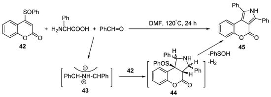 Grigg and Vipond synthesized the 1,3-diphenylpyrrolo[3,4-c]chromene-4-one (45) in 51% yield by the 1,3-dipolar cycloaddition reaction of nitrile imine 43, prepared in situ from phenylglycine and benzaldehyde [83]. Thermal elimination of phenylsulfenic acid from the intermediate dihydropyrrole derivative 44 followed by oxidation in the reaction conditions resulted in the final product 45 (Scheme 15).