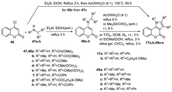 Alberola et al. prepared [1] benzopyrano[4,3-b]pyrrol-4(1H)-ones 17a,b, 49a–e from 4-acylamino- or 4-ketalaminocoumarin derivatives 48a–h under different conditions using acetic acid/water, or Me3SiI in chloroform or TiCl4 in dichloromethane (DCM) or EtONa in ethanol or silica gel in chloroform [84]. Compounds 49a–e were prepared in high yields of 71–92% through the method with acetic acid/water. TiCl4 in DCM resulted in the synthesis of 49b,d in yields of 88% and 92%, respectively. Compounds 17a,b were synthesized from 48f,g under treatment with EtONa in ethanol in 75% and 89% yields, respectively. Compound 49e was prepared from 48h in silica gel and chloroform in 89% yield. One-pot reaction of 46 with 47c afforded compound 49c in 80% yield (Scheme 16). 4-Acylamino- and 4-ketalaminocoumarin derivatives 48a–h were synthesized from the reaction of 4-chlorocoumarin (46) with acylamine chlorohydrates or ketalamines 47a–h under treatment with Et3N in refluxing ethanol.