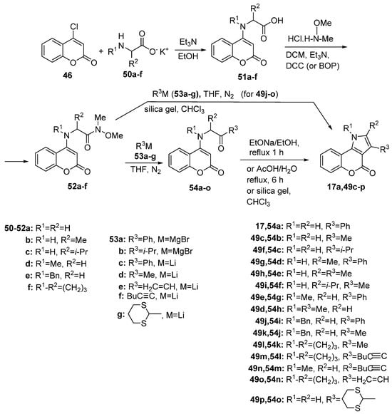 The same group of Alberola et al. reported the synthesis of [1] benzopyrano[4,3-b]pyrrol-4(1H)-ones 17a, 49c–p from the Weinreb α-aminoamides 52a–f [85]. The N(α)-(2-oxo-2H-1-benzopyran-4-yl) Weinreb α-aminoamides (52a–f) were prepared in 73–87% yield from the α-aminoacid derivatives 51a–f (generated from the reaction of 4-chlorocoumarin (46) with α-aminoacid potassium salt) under treatment with N,O-dimethyl hydroxylamine. Weinreb amides reacted with organomagnesium or organolithium compounds 53a–g to give 4-ketonylaminocoumarins 54a–h,o in 51–92% yield (Scheme 17). Cyclization of the latter under different conditions, EtONa in ethanol (for 54a–f,o), acetic acid/water (for 54g) or evaporation with silica gel in chloroform (for 54h), furnished the fused pyrrolocoumarins 17a, 49c–i,p in 69–92% yield. The reactions of Weinreb amides with organolithium compounds in silica gel and chloroform, in the case of the expected 4-ketonylaminocoumarins 54i–n, led through a one-pot process to the cyclization products 49j–o in 15–81% yield without the isolation of the intermediates.