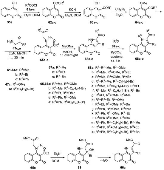 Liao et al. synthesized [1] benzopyrano[4,3-b]pyrrol-4(1H)-ones 66a–e from 4-hydroxycoumarin (35a) in 30–40% yield through six steps (acylation, isomerization, protection of hydroxyl group, nucleophilic substitution) and the cyclization of enamines 65a–e followed by dehydration [87]. For the mechanism of the cyclization reaction, the intermediate hydroxy compound 69 was isolated during the treatment of enamine 65c with base (Et3N) (Scheme 19). Hydroxy derivative 69 resulted in the final product 66c under elimination of water. N-Alkylation of 66a–e with halides 67a–c in the presence of K2CO3 at room temperature afforded the trisubstituted fused pyrrolocoumarins 68a–o.
