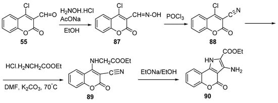 Kamal El-Dean et al. synthesized ethyl 3-amino-4-oxo-1,4-dihydrochromeno[4,3-b]pyrrole-2-carboxylate (90) from 4-chloro-3-cyanocoumarin (88) through the adduct with glycine ethyl ester (47m) followed by cyclization (Scheme 24). This new compound presented low antifungal activity as tested against Candida albicans and Geotrichum candidum [92].