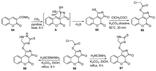 El Azab and Elkanzi presented the synthesis and biological evaluation of 1-mercapto- or 1-thiochromeno[3,4-c[pyrrol-3,4-dione derivatives 95–98 as antimicrobial agents [94]. The reaction of coumarin-3-ylcarboxamide (94) with CS2 led via the intermediate A to 1-mercaptopyrrolo[3,4-c]chromene-3,4-dione (95) in 85% yield (Scheme 26). Derivative 94 was the key compound for the synthesis of chloroacetylthio-derivative 96, the heterocyclic derivatives 97, 98 and other N-heterocycle derivatives. All the new compounds were tested for their in vitro antibacterial activity against two Gram-positive species, Bacillus subtilis RCMB 010067 and Staphylococcus aureus RCMB 0100010, and two Gram-negative species, Pseudomonas aeuroginosa RCMB 010043 and Escherichia coli RCMB 010052. Compound 98 presented high activity, greater against Gram-positive bacteria than the Gram-negative ones. The compounds were also evaluated for their in vitro antifungal activity against two fungal species, Aspergillus fumigatus RCMB 02568 and Candida albicans RCMB 05036. Compound 96 demonstrated high antifungal activity, while compound 98 presented moderate activity, and compound 97 had low activity.