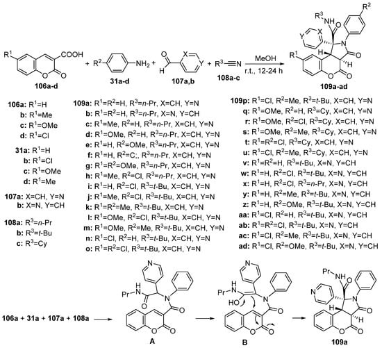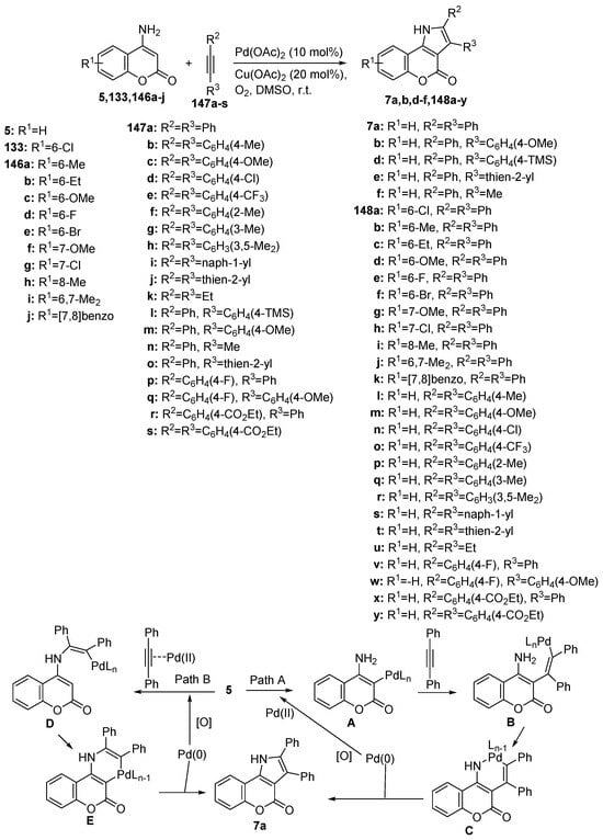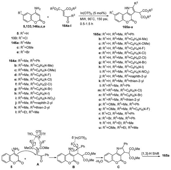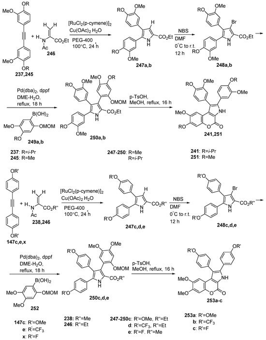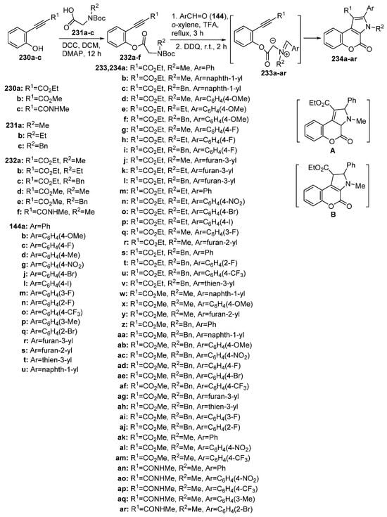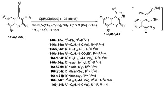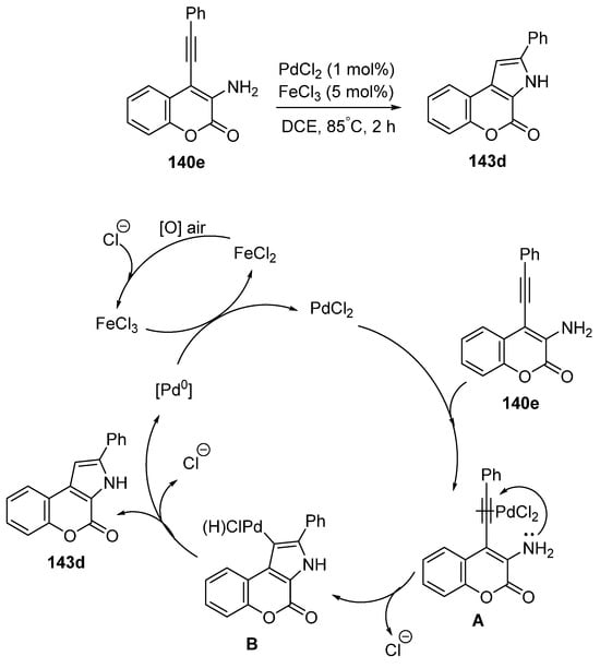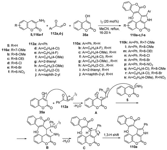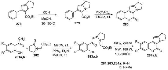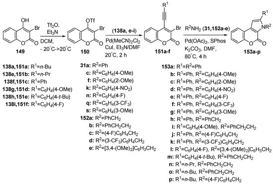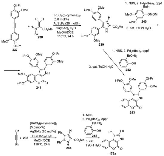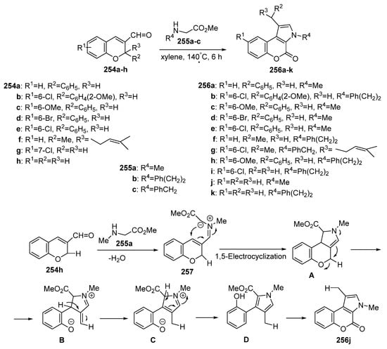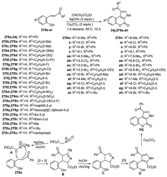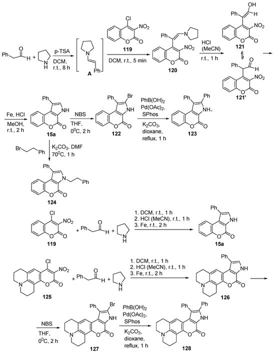 As starting materials for the formation of pyrrole moiety, different fused heterocyclic coumarin derivatives have been used: 3- or 4-aminocoumarins or hydroxycoumarins, chlorocoumarins, or other coumarin derivatives [69]. Multicomponent reactions (MCR) or metal-catalyzed reactions have been utilized for the synthesis of pyrrole ring of [3,4]-fused pyrrolocoumarins.