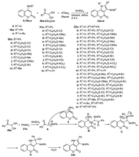 Synthesis of 3-arylaminochromeno[4,3-b]pyrrol-4(1H)-ones 32a–c by the one-pot two-step reaction of phenyl glyoxal monohydrate (26a) with arylamines and 4-aminocoumarin (5).