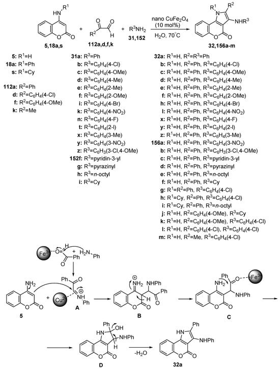 Mukherjee et al. synthesized 3-arylaminochromeno[4,3-b]pyrrol-4(1H)-ones 32a–c by a similar one-pot two-step reaction of phenyl glyoxal monohydrate (26a) with arylamine 31a–c and 4-aminocoumarin (13) in the presence of Bronsted acid-surfactant reagent PEG-SO3H [53]. In the first step, the reaction of phenyl glyoxal with arylamine afforded imine derivative A. Michael addition of 4-aminocoumarin (5) to A in the second step, followed by cyclization and removal of water, resulted in the final product (Scheme 11). Compounds 32a–c were found to be cell-permeable and exhibiting fluorescence “turn-off” in the presence of Cu2+ ions in fluorescent imaging of human cervical cancer (HeLa) cells.