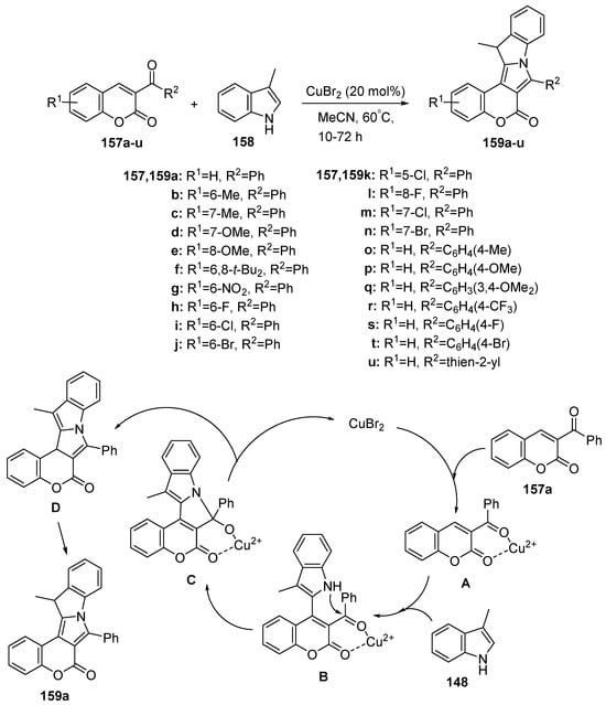 - Jin, S.-J.; Guo, J.-M.; Zhu, Y.-S.; Wang, Q.-L.; Bu, Z.-W. A copper-catalyzed tandem reaction for the construction of coumarin fused 9H-pyrrolo[1,2-a]indoles. Org. Biomol. Chem. 2017, 15, 8729–8737. [Google Scholar] [CrossRef]