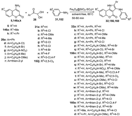- Mukherjee, S.; Sarkar, S.; Pramanik, A. A sustainable synthesis of functionalized pyrrole fused coumarins under solvent-free conditions using magnetic nanocatalyst and a new route to polyaromatic indolocoumarins. ChemistrySelect 2018, 3, 1537–1544. [Google Scholar] [CrossRef]