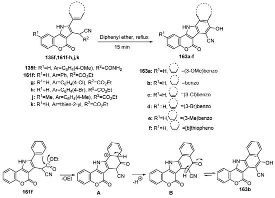 Paul and Das reported the synthesis of 3-aryl-4(H)-oxo[1]benzopyrano[4,3-b]pyrroles 17a–h from 4-aminocoumarin (5) and β-nitrostyrenes 16a–h in the presence of the polymer-supported catalyst PEG-SO3H in 72–85% yield [73]. In the proposed mechanism, PEG-SO3H catalyzed the Michael addition of 5 to the β-nitrostyrene. Subsequent intramolecular amine attack of the Michael adduct A afforded the cyclized intermediate B. Elimination of water and nitroxyl molecules resulted in the final product (Scheme 5).