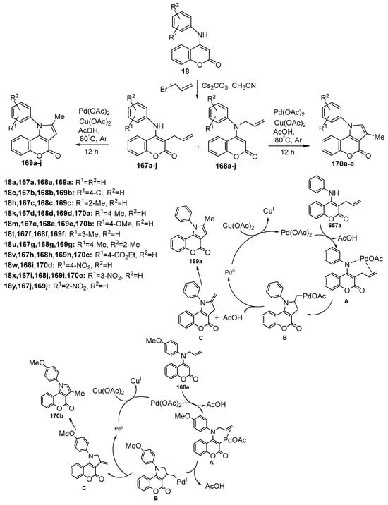 - Majumdar, K.C.; De, N.; Roy, B. Iron/Palladium-catalyzed intramolecular hydroamination: An expedient synthesis of pyrrole-annulated coumarin and quinolone derivatives. Synthesis 2010, 2010, 4207–4212. [Google Scholar] [CrossRef]