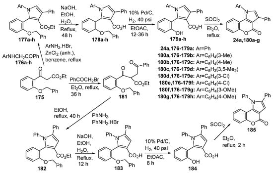 Trkovnic et al. reported the synthesis of 2-phenyl-4H-pyrro1o[3,2-c][1]benzopyran-4-one (41) in 83% yield by the treatment of 4-hydroxy-3-phenacylcoumarin (40) with acetic acid in the presence of ammonium acetate [82]. Compound 40 was synthesized in 59% yield by the reaction of 4-hydroxycoumarin (35a) with phenacyl bromide (Scheme 14).
