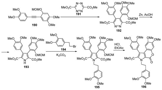 - Boger, D.L.; Soenen, D.R.; Boyce, C.W.; Hedrick, M.P.; Jin, Q. Total synthesis of ningalin B utilizing a heterocyclic azadiene Diels-Alder reaction and discovery of a new class of potent muti drug resistant (MDR) reversal agents. J. Org. Chem. 2000, 65, 2479–2483. [Google Scholar] [CrossRef]
