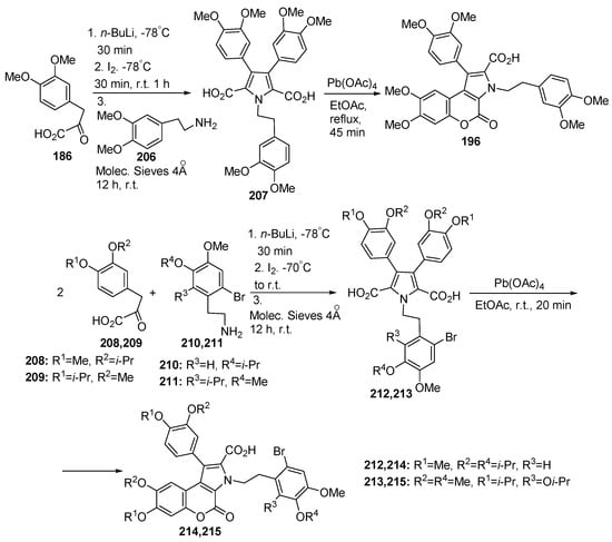 - Lade, D.M.; Pawar, A.B.; Mainkar, P.S.; Chandrasekhar, S. Total synthesis of lamellarin D trimethyl ether, and lamellarin H. J. Org. Chem. 2017, 82, 4998–5004. [Google Scholar] [CrossRef]
