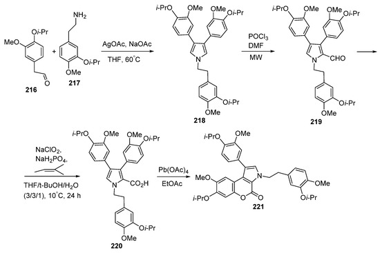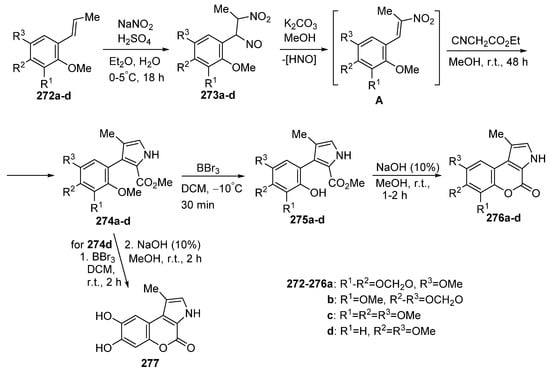 - Silyanova, E.A.; Samet, A.V.; Salamandra, L.K.; Khrustalev, V.N.; Semenov, V.V. Formation of 2,3-diarylpyrrole- and pyrrolocoumarin core of natural marine products via Barton-Zard reaction and selective O-demethylation. Eur. J. Org. Chem. 2020, 2020, 2093–2100. [Google Scholar] [CrossRef]