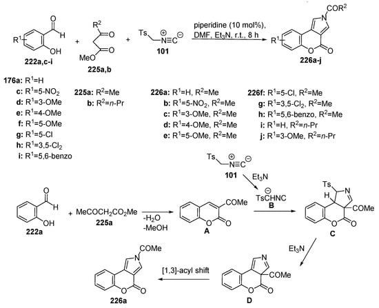 Synthesis of chromeno[3,4-c]pyrroles 102a–c by [3 + 2] cycloaddition reaction of TosMIC with coumarins.