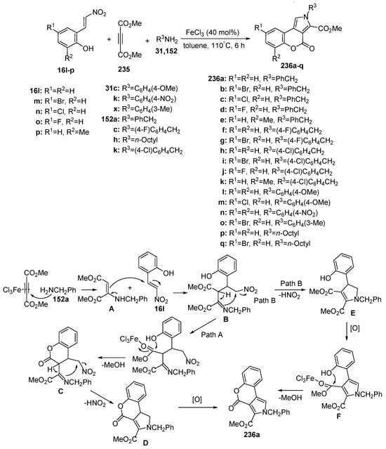 - Xue, S.; Yao, J.; Liu, J.; Wang, L.; Liu, X.; Wang, C. Three-component reaction between substituted 2-(2-nitrovinyl)phenols, acetylenedicarboxylate and amines: Diversity-oriented synthesis of novel pyrrolo[3,4-c]coumarins. RSC Adv. 2016, 6, 1700–1704. [Google Scholar] [CrossRef]