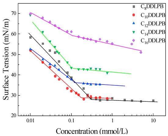 The CMC values of the five double-chain lactose amide quaternary ammonium salts (CnDDLPB) decrease in the order of C8DDLPB > C10DDLPB > C12DDLPB > C14DDLPB > C16DDLPB (Figure 3). Their CMC values decrease linearly with the growth of the hydrophobic carbon chain [26]. This result is attributed to the fact that, when two carbon chains of the surfactant molecule become longer, the space occupied by the molecules arranged at the interface is saturated more rapidly. The larger the space occupied by the two carbon chains of the surfactant molecules, the faster the molecules arranged at the interface reach saturation; at the same time, the longer the carbon chains, the hydrophobicity of the hydrocarbon bonds is gradually enhanced, indicating that the separation formed between the hydrophilic head groups under the action of electrostatic repulsive force is hindered, rendering a significant promotion effect on the development of aggregates in the surfactants. The shorter the carbon chain, the lower the surface tension. The surface tension of the C8DDLPB aqueous solution can be reduced to 27.82 mN/m. The inflection point of CMC on the curve of the change in the surface tension with the C16DDLPB concentration is not extremely clear, which may be attributed to the fact that the two hydrophobic carbon chains are extremely long and lead to poor solubility and a low surface activity.