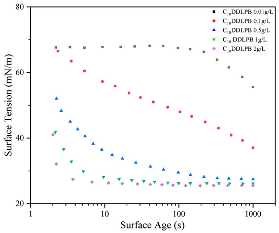 Dynamic surface tension can be used to study the adsorption–diffusion kinetics of surfactants at the air–water interface. In this study, the dynamic surface tension changes in C10DDLPB were measured in the concentration range of 0.01 g/L–2 g/L by the suspended droplet method, and the dynamic surface tension of CnDDLPB with five different carbon chain lengths at a concentration of 1 g/L (25 °C) was measured in detail.