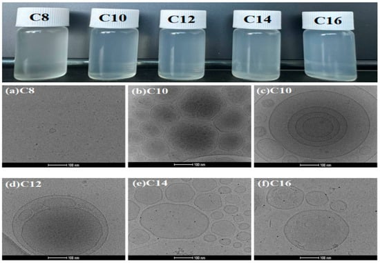 The appearance of the prepared solutions also reveals that C8DDLPB is a translucent light gray solution and that C10DDLPB-C16DDLPB is a light blue solution. During vesicle formation, surfactant molecules aggregate at the water–oil interface and form a closed structure with hydrophobic chains inside and hydrophilic chains outside. The length of the hydrophobic chains is critical to the stability of the vesicles. Surfactant molecular structures with two hydrocarbon chains and large head groups are prone to spontaneous vesicle formation [27,28,29]. The molecular structure of the surfactant synthesized herein (CnDDLPB) is in agreement with such features. However, in case of a short-carbon chain, sufficient hydrophobic forces cannot be provided to maintain the stability of vesicles, resulting in the facile rupture of vesicles. In addition, surfactant molecules with a short-carbon chains exhibit a high degree of expansion in an aqueous solution, indicating that the formation of tight aggregation structures by these short-carbon chains is difficult and that water molecules cannot be wrapped effectively to form complete vesicle structures.