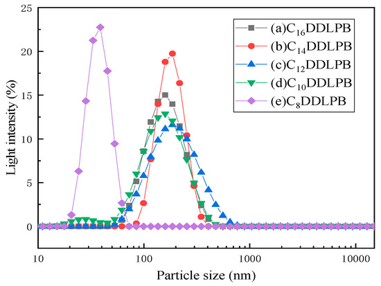 Particle size distributions of (a) C16DDLPB, (b) C14DDLPB, (c) C12DDLPB, (d) C10DDLPB, and (e) C8DDLPB.