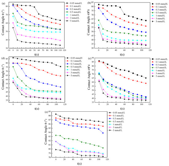 The effect of surfactant concentration on the contact angle of PTFE surface: (a) C8DDLPB, (b) C10DDLPB, (c) C12DDLPB, (d) C14DDLPB, and (e) C16DDLPB.