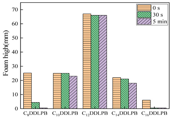 According to the Ross–Miles method, the foam performance of CnDDLPB was evaluated. The prepared solution (1 g/L) was placed in a constant-temperature water bath at (30 ± 0.5) °C for preheating for 30 min. Subsequently, the prepared solution was measured using a foam analyzer. The foam stability was determined based on the initial foam height and the subsequent change in foam height over a specified duration [47].