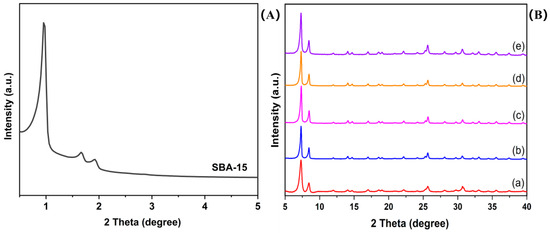 Small-angle X-ray diffraction (SXRD) is a highly effective method for characterizing the structural organization of materials, particularly in the identification of ordered mesoporous structures, making it a prominent technique in material characterization [41,42]. The SXRD patterns of SBA-15 are depicted in Figure 1A, revealing a characteristic pattern featuring a prominent reflection at 2θ approximately 1.0° (corresponding to the (100) plane indicative of a cavity with hexagonal symmetry).