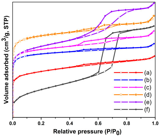 N2 adsorption–desorption measurements were conducted on UiO-66-Br2, SBA-15, and the UiO-66-Br2/SBA-15 composites to assess their textural characteristics, with the resulting isotherms presented in Figure 2. UiO-66-Br2 exhibits a type I isotherm, indicative of its microporous nature. The BET surface area of UiO-66-Br2 is approximately 515.9 m2/g, a value in close agreement with the literature [43,44]. The isotherms of SBA-15 (Figure 2f) exhibited a type IV classification with a H1-type hysteresis loop, indicating the mesoporous nature of the material. The presence of both micropores and mesopores in all hybrid composites was indicated by the observation of type I and type IV isotherms. Furthermore, the hysteresis loops derived from the mesopores exhibited increasing prominence with higher concentrations of SBA-15.