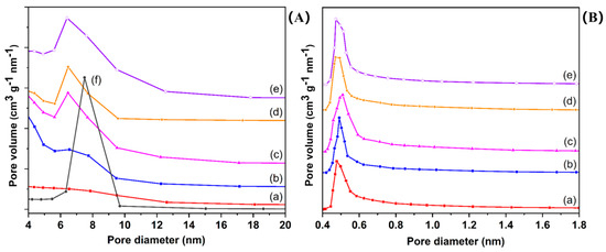 Mesopore size distributions (A) obtained by BJH method for (a) UiO-66-Br2, (b) U6B2S1, (c) U6B2S3, (d) U6B2S5, (e) U6B2S7, and (f) SBA-15, as well as their respective micropore size distributions (B) obtained by the HK method.