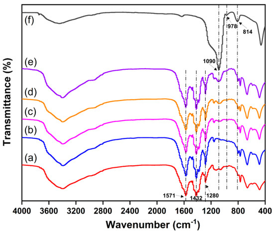 The FT-IR spectra of all samples are shown in Figure 5. In the case of UiO-66-Br2 (Figure 5a), the characteristic absorption at 1571 and 1280 cm−1 can be assigned to the asymmetric and symmetric stretching vibrations of carboxyl groups present in the H2BDC-Br2 ligands [45]. The absorption at 1432 cm−1 should be attributed to the C=C skeletal ring vibration of aromatic groups. For SBA-15 (Figure 5f), the strong peak at 1090 cm−1 is associated with the asymmetric stretching of the Si-O-Si bonds in the silicon–oxygen tetrahedral structure, while a weaker band at 804 cm−1 corresponds to the symmetric stretching vibrations. The distinctive vibrational band attributed to Si-OH groups was observed at around 978 cm−1 [46]. Analysis of the FT-IR spectra depicted in Figure 5b–e revealed a similarity between the spectra of all UiO-66-Br2/SBA-15 composites and that of pure UiO-66-Br2. Despite the relatively low intensity of the two adsorption bands corresponding to Si-O-Si, their presence in the composites was confirmed as evidenced by their detectability.