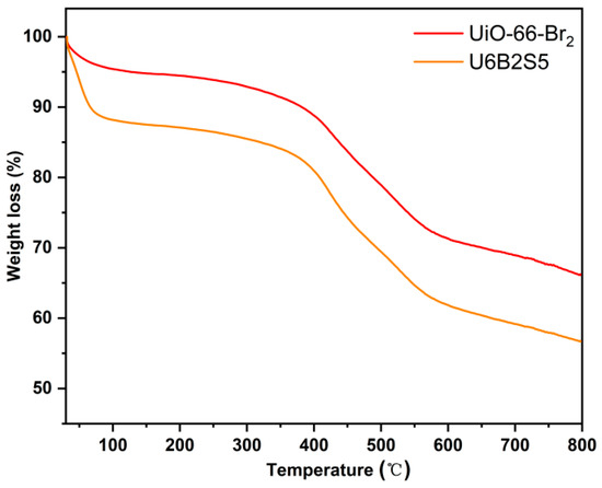 Thermal stability of materials is one of the key factors that determine their suitability for practical CH4/N2 separation applications. Therefore, thermogravimetric measurements for UiO-66-Br2 and U6B2S5 were performed in the temperature range from ambient temperature to 800 °C. As shown in Figure 6, it can be found that the two samples exhibited similar trend of thermogravimetric curves with the initial weight loss stage, attributed to the removal of adsorbed solvent and water molecules, occurring at temperatures below 100 °C. Subsequent weight loss was attributed to the decomposition of H2BDC-Br2 ligands and the collapse of the UiO-66-Br2 structure.
