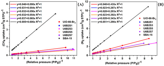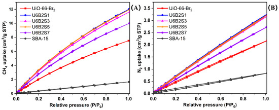 To further investigate the impact of SBA-15 on the growth of UiO-66-Br2, the mesopore and micropore size distributions of the samples were graphically represented in Figure 3. The BET surface areas, total pore volumes, and micropore volumes of the samples were presented in Table 1. The hybrid material exhibits a reduced total pore volume when compared to SBA-15 (0.77 cm3/g), yet it is marginally higher than pristine UiO-66-Br2. Additionally, the most probable pore diameters of the mesopores in the hybrid material are smaller than that of SBA-15, suggesting partial obstruction of the mesopores by UiO66-Br2 crystal fillings. These observations suggest that the formation of the MOF took place on both the internal and external surfaces of the SBA-15 material. Moreover, the total pore volumes of the composites exhibited a positive correlation with the quantity of SBA-15, suggesting that elevated concentrations of SBA-15 could potentially result in underutilization of the volumes. The integration of UiO66-Br2 with SBA-15 led to an increase in micropore volumes in the hybrid materials, indicating a synergistic interaction between the two materials. Therefore, it was hypothesized that SBA-15 served as a template for the growth of MOF crystals, with the formation of new micropores attributed to interactions between surface silanol groups and metal centers. In comparison to other composite materials, U6B2S5 demonstrates better structural attributes, evidenced by a micropore volume of 0.26 cm3/g and a high surface area value of 607.2 m2/g. The adsorption capacity of the materials is influenced by the BET surface area and pore size distribution, which also determine the samples’ capacity for selective CH4 adsorption.