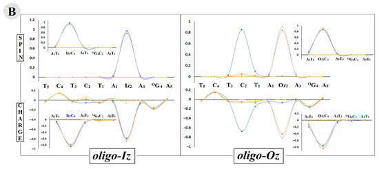 neutral form. The raw data of the charge and spin distribution have been given in Tables S3 and S4 (Supplementary Materials). (B) A graphical visualization of the spin distribution within oligo-Iz and oligo-Oz. The raw data have been given in Table S5.