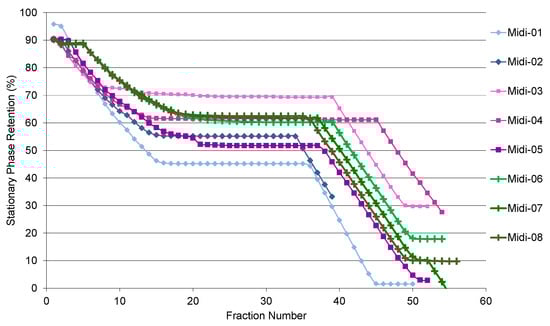 There are two stages of stationary phase stripping when the step gradient is applied (Figure 1). The first stage occurs during the first 25 min (15 fractions) right after injection, as it takes time for the sample to travel through the 912 mL column. A plateau region on the graph, starting between 0.7 and 0.8 of the column volume, is where most of separation occurs. The optimum initial retention of this region should be 60% or higher. The second stage of the stationary phase stripping occurs after the step gradient switch (fraction 34 onwards, depending on the flow rate). When run at 50 mL·min−1 with 2 g of sample and the sample solution obtained in the stationary phase (HMWat 2 lower phase), the overall loss of SP was 55%, before the step gradient (run Midi-01). Changing the sample solvent to methanol in run Midi-02 led to 10% less stripping, which was still below the target of 60%. Decreasing the mobile phase flow rate to 40 mL·min−1 and the sample volume to 10 mL (1% of the column volume) allowed the column to achieve 70 and 61% of the SP value for a 100 and 200 mg/mL sample concentration, respectively (runs Midi-03, 04), although this dropped to 52% when the concentration was raised to 400 mL/min (run Midi-05). Finally, 254 mg/mL was found to be the optimum sample concentration in methanol, achieving 60% of the SP retention after the injection stage, showing good reproducibility, as seen for runs Midi-06, 07, and 08. Interestingly, the SP stripping after the step gradient varies slightly, but the slope was identical for each run when the sample was made up in methanol.