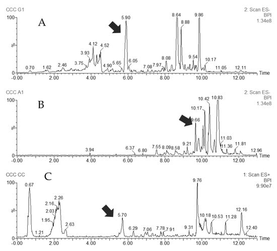 UHPLC–MS chromatograms of three pooled CCC fractions: (A) LC-ESI(-)-MS, a reddish fraction containing the most polar components, from which 3(R)-7-O-methylvestitol (Compound 3) was isolated; (B) LC-ESI(-)-MS, an almost pure fraction of a prenylated benzophenone (Compound 1); (C) LC-ESI(+)-MS, a red pigment, retusapurpurin A (Compound 2), from extrusion fraction. Arrows indicate the target compound.