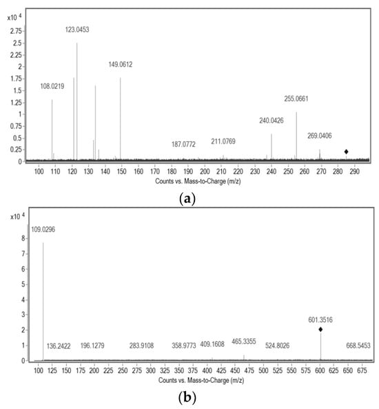 MS/MS spectra of the isolated compounds: (a) ESI-(-)-MS/MS of m/z 285.1141; (b) ESI-(-)-MS/MS of m/z 601.3516; (c) ESI-(+)-MS/MS of m/z 523.2852.