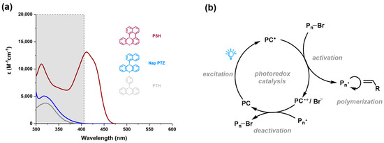 (a) A comparison of UV–Vis absorption profiles of PSH, Nap-PTZ, and PTH. (b) A typical mechanism for the photoredox catalyst-mediated O-ATRP.