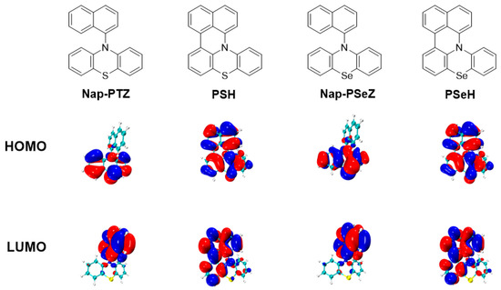 The HOMO and LUMO distribution of Nap-PTZ, PSH, Nap-PSeZ, and PSeH.