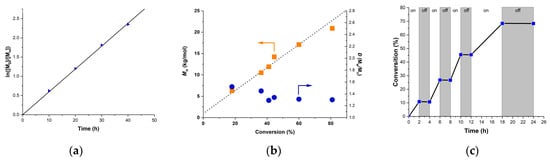 The kinetics of the polymerization of MMA were studied at catalyst loadings of 100 ppm, as shown in Figure 4a,b, which unveiled a linear growth of molecular mass upon monomer conversion (up to 80% conversion). It can be observed that there is a linear relationship in the whole process of polymerization, and the dispersity remains within a relatively narrow range, demonstrating a constant concentration of propagating radicals and a pseudo first-order kinetics of the photo-ATRP. Effective temporal control over the polymerization by irradiation was also demonstrated through the light on–off experiment (Figure 4c), and no monomer conversion was observed during the dark periods. It can be assumed that photoexcited PCs activate the dormant species, and the chain grows only when the light is on, thus achieving a light regulation over the chain propagation.