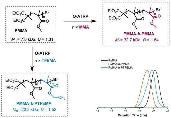 PSeH was further applied to the polymerization of different monomers, and the results are summarized in Table 3. The polymerization of methacrylate monomers, including benzyl methacrylate (BzMA), trifluoroethyl methacrylate (TFEMA), tert-butyl methacrylate (t-BMA), and 3-(trimethoxysilyl)propyl methacrylate (TSPMA), proceeded in a controlled manner in terms of molecular weight and low dispersity under white LEDs (entries 1–5). It is worth noting that the PSeH could also deliver an efficient polymerization of glycerol acrylate (GMA). Furthermore, chain-extension polymerizations were also carried out using the isolated PMMA macroinitiator (Mn = 7.8, Đ = 1.31), which was prepared with PSeH as the photocatalyst and DBMM as the initiator under the standard reaction conditions. As shown in Figure 5, two block polymers, PMMA-b-PMMA and PMMA-b-PTEFMA, were successfully prepared, indicating that good fidelity of the chain-end groups was achieved in the PSeH-mediated radical polymerization.
