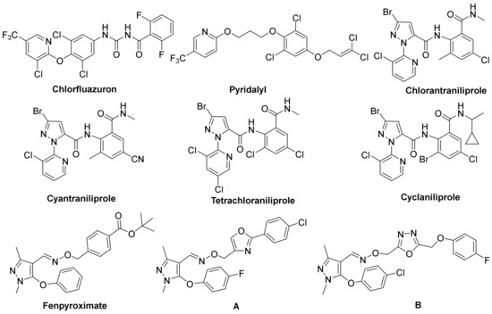 Structures of Chlorfluazuron, Pyridalyl, Chlorantraniliprole, Cyantraniliprole, Tetrachloraniliprole, Cyclaniliprole, Fenpyroximate and compounds A–B.