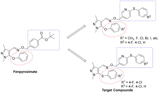 In addition, pyrazole oxime ethers are also significant N-heterocyclic compounds, which act as an active pharmacophore during the development of new agrochemicals and drugs [21,22]. Many pyrazole oxime ether derivatives are reported to display various pesticidal and pharmacological activities involving fungicidal [23], insecticidal [24], anti-TMV [25], and antiproliferative effects [26]. For instance, Fenpyroximate (Figure 1) was an outstanding acaricide invented by Nihon Nohyaku in 1991. In the past few decades, Fenpyroximate has been extensively applied in protecting certain kinds of crops because of its efficient insecticidal activities towards agricultural mites like Polyphagotarsonemus latus (Banks), Tetranychus urticae (Koch), and so on [27]. Thereafter, many studies about the structural derivation of Fenpyroximate were performed. Recently, Wang et al. found that oxazole-containing pyrazole oxime ether derivative A (Figure 1) had a broad spectrum of insecticidal and fungicidal properties [28]. Sun et al. reported pyrazole oxime ether B (Figure 1) with an aryloxy-linked 1,3,4-oxadiazole moiety displaying satisfactory insecticidal effects [29]. This greatly promoted the development of bioactive pyrazole oxime ether molecules.