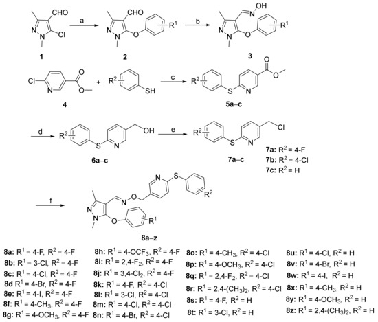 The synthetic pathways for the title compounds 8a–z and 11a–f are illustrated in Scheme 1 and Scheme 2, respectively. The crucial intermediates 3 were efficiently synthesized through a two-step process, selecting 5-chloro-1,3-dimethyl-1H-pyrazole-4-carbaldehyde (1) as the starting material. The reaction of intermediate 1 with diverse substituted phenols or substituted thiophenols was conducted under alkaline conditions to produce compounds 2 or 9a,b smoothly. Next, intermediates 2 or 9a,b were reacted with hydroxylamine hydrochloride, utilizing potassium hydroxide as the base to afford the key intermediates 3 or 10a,b conveniently. The important synthons 5-chloromethyl-2-(substituted phenylthio)pyridine (7a–c) were prepared from commercially available methyl 6-chloronicotinate (4). Compound 4 underwent an aromatic nucleophilic substitution with substituted thiophenols, choosing potassium carbonate as the deacid reagent and DMF as the solvent to generate intermediates 5a–c in good yields. The further reduction reaction with LiAlH4 obtained compounds 6a–c successfully. Compounds 6a–c were then converted into the significant intermediates 7a–c by treatment with thionyl chloride. Subsequently, compounds 7a–c were treated with the important intermediates 3 or 10a,b in N and N-dimethylformamide, utilizing potassium carbonate as the acid scavenger to obtain the desired compounds 8a–z and 11a–f in satisfactory yields. Additionally, the structures of the targeted compounds 8a–z and 11a–f were effectively determined by 1H NMR, 13C NMR and HRMS.
