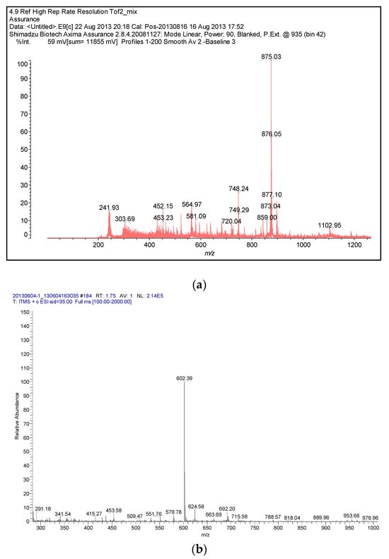 Experimental data, such as FT-IR, 1H NMR, UV, MS, and a fluorescent assay, provided evidence for the formation ofsulfonamide-containing naphthalimides (SN-2NI and SD-NI) (Figure 1, Figure 2, Figure 3, Figure 4 and Figure 5), which were synthesized by the incorporation of a NI fluorescent molecule to SN and SD as the tumor-targeting groups (Scheme 1). The MS spectra of SN-2NI displayed the correct [M+H]+ peak of 875.03 in accordance with the molecular weight of SN-2NI (MW 874) (Figure 1a). The MS spectra of SD-NI also indicated the correct peak of [M+H]+ (602.39), which was consistent with the molecular weight of SD-NI (MW 601) (Figure 1b).