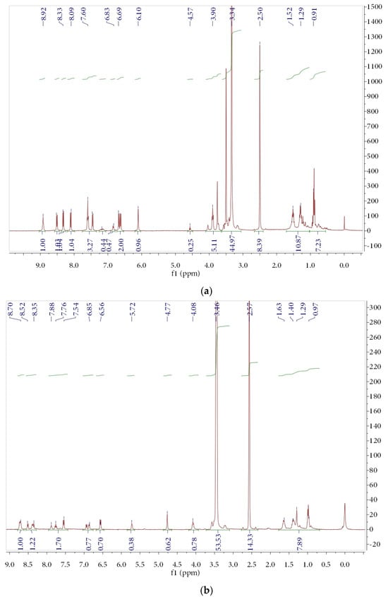 The 1H NMR spectra of SN-2NI and SD-NI indicated the typical peaks of naphthalimide ring and methyl and benzyl groups, which appeared at 8.9–8.0 ppm, 1.65–0.8 ppm, and 7.7–7.4 ppm, respectively (Figure 2a,b), indicating that NI was covalently bound to SN and SD, respectively. The IR spectra of SN-2NI and SD-NI showed the characteristic absorption peaks of amide bond (CONH)with 1640–1570 cm−1, amino group (NH) at 3450–3420 cm−1, and benzyl groups varying from 1150 to 660 cm−1, respectively (Figure 3a,b), which indicated that both SN and SD were covalently bound to NI.