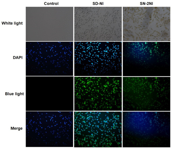 B16F10 melanoma cells (1 × 105/mL) were seeded in 24-wellplates in the DMEM media (10% fetal bovine serum (Gibco. Co., Chagrin Falls, OH, USA), 100 units/mL penicillium and 100 µg/mL streptomycin), respectively. These cells were incubated for 24 h in an incubator (37 °C, 5% CO2), and the growth medium was then replaced with SN-2NI, SD-NI solutions in growth medium or pure growth medium (200 µL), respectively. Cells were incubated for 2 h, washed using PBS three times, and then fixed with paraformaldehyde (0.5 mL, 4%) for 10 min. The cell morphology and density were observed in an IX-70 inverted fluorescence microscope (Olympus Co., Ltd., Tokyo, Japan).