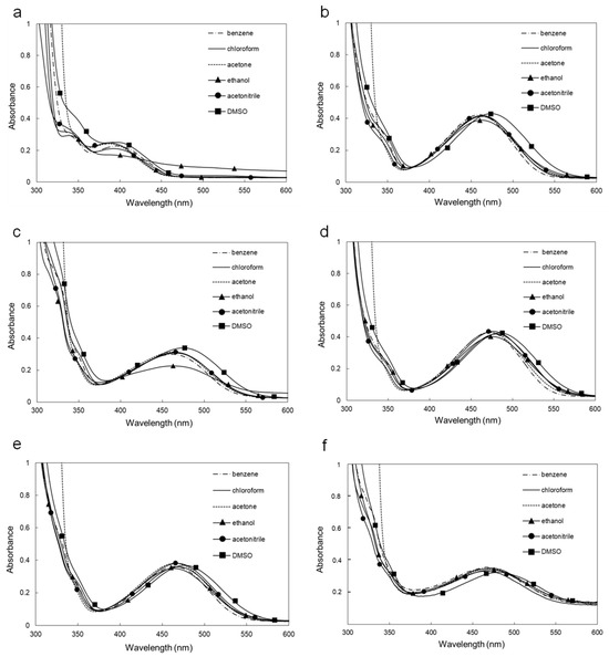 | benzene | 396 (3.36) | 460 (3.63) | 461 (3.48) | 471 (3.63) | 464 (3.56) | 468 (3.27) |