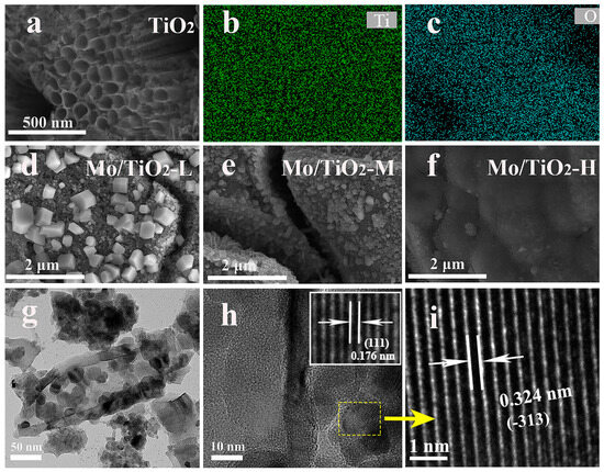 (a) SEM image of TNTAs, and (b,c) the corresponding EDS mapping images. SEM images of (d) Mo/TiO2-L, (e) Mo/TiO2-M, and (f) Mo/TiO2-H. (g,h) TEM and (i) HR-TEM images of Mo/TiO2-M.