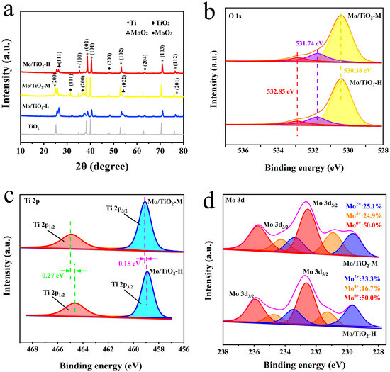 (a) XRD patterns of TiO2, Mo/TiO2-L, Mo/TiO2-M, and Mo/TiO2-H. High-resolution XPS spectra of Mo/TiO2-M and Mo/TiO2-H: (b) O 1s, (c) Ti 2p, and (d) Mo 3d regions.
