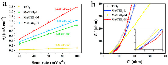 (a) Double-layer capacitances of TiO2, Mo/TiO2-L, Mo/TiO2-M, and Mo/TiO2-H electrodes. (b) Nyquist plots of TiO2, Mo/TiO2-L, Mo/TiO2-M, and Mo/TiO2-H electrodes.