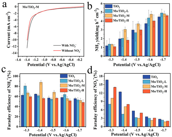 Figure 5b shows that the most preferred NH3 production of TiO2, Mo/TiO2-L, Mo/TiO2-M, and Mo/TiO2-H was reached at −1.6 V vs. Ag/AgCl, as the NH3 yield did not change much as the voltage continued to increase. Additionally, the highest NH3 productions of samples are reached at −1.7 V vs. Ag/AgCl. Among them, Mo/TiO2-M and Mo/TiO2-H exhibit the highest NH3 yields, around 5.18 mg h−1 cm−2 and 5.20 mg h−1 cm−2, respectively. Moreover, as shown in Figure 5c, the highest FE was 88.05%, corresponding to Mo/TiO2-M at −1.4 V vs. Ag/AgCl. Meanwhile, the highest FEs of 65.50%, 85.98%, and 63.91% were achieved for TiO2, Mo/TiO2-L, and Mo/TiO2-H, respectively. It can be seen that the FEs of Mo/TiO2-M remain at a high value at different voltages. This indicates that Mo/TiO2-M has superior NO3−RR performance, which may be due to the appropriate grain size of MoOx in Mo/TiO2-M. Moreover, Table S1 compares the NO3−RR performance of Mo/TiO2-M with other previously reported electrodes. The FE and NH3 yields of the Mo/TiO2-M electrode are comparable to most of the previous cathodes, further indicating the good activity of the as-prepared Mo/TiO2-M electrode [27,54,55,56,57,58,59].
